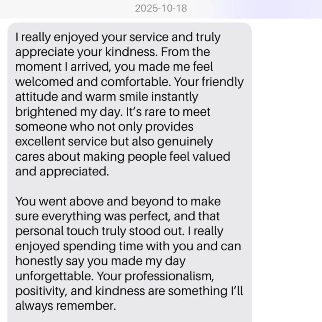 im a sensual blend of sweetness and affection! My feminine touch would leave you speachless. I provide non-rush and safe service to make sure we live the most unforgettable moment together!